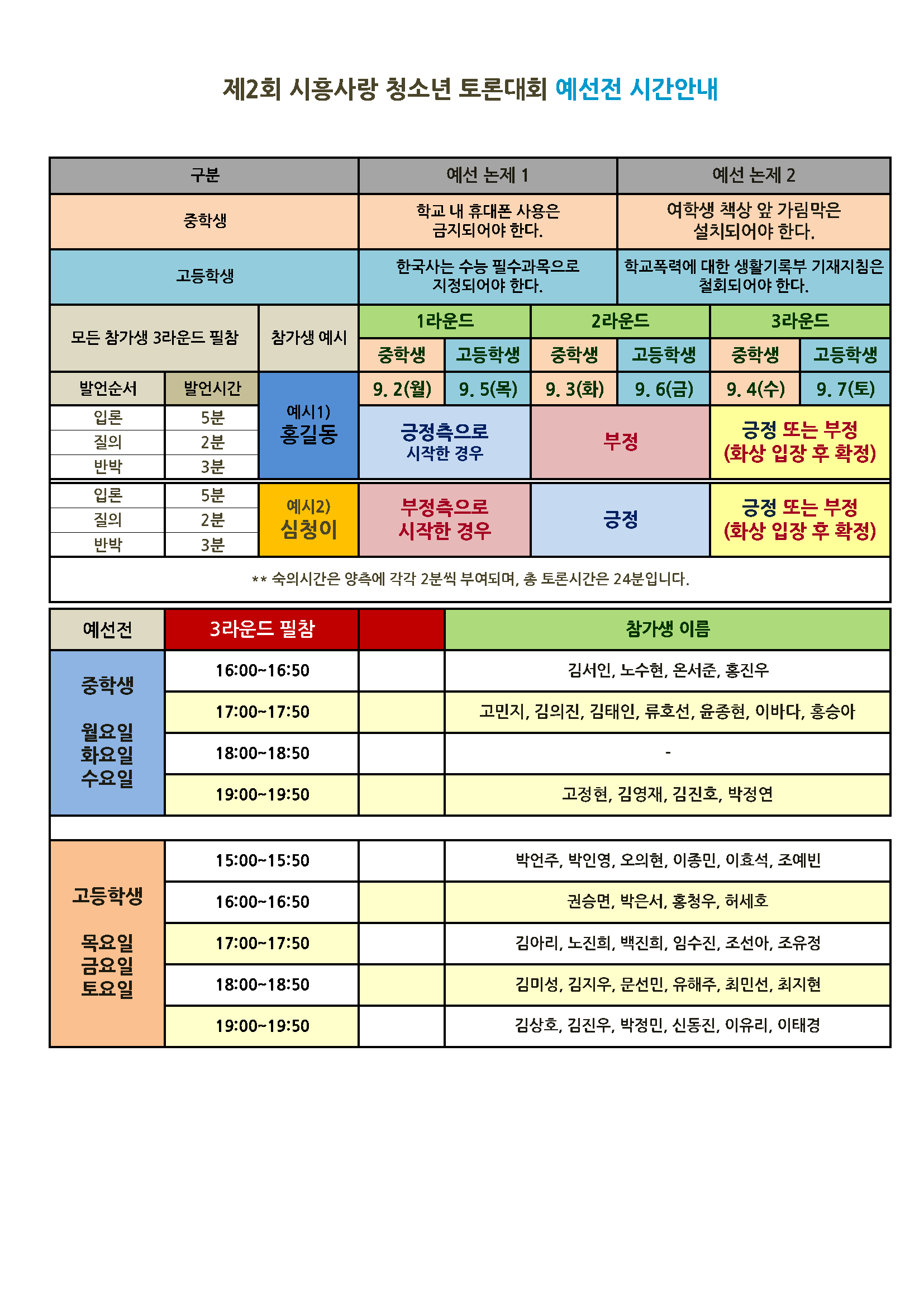 [시흥사랑토론대회_중등부] 예선결과발표_본선진출자&논제안내 (0) | 2020.03.22 |