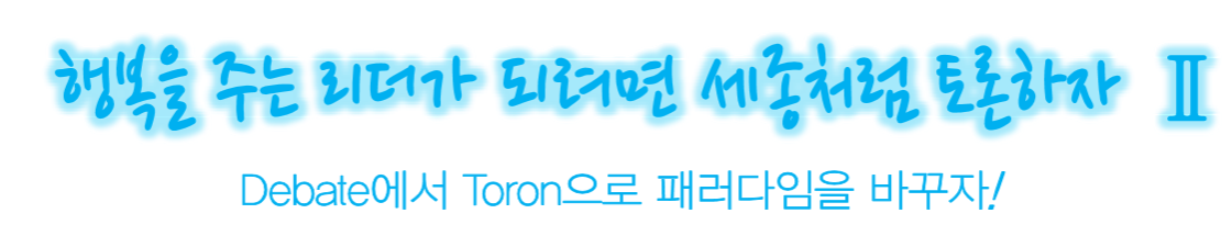 나는 토론교육의 새로운 패러다임으로, 현재 쓰이는 debate 대신 우리말인 토론(討論)의 영어식 표현인 toron을 제시하고자 한다. Toron은 싸워 이기는데 목적을 두는 debate와 달리 소통에 목적을 둔다. 즉 토론에 참여하는 양측의 목적은 상호이해에 있다. 포스와 포스(Foss & Foss, 2003)는 이를 정복(conquest)이나 설득(혹은 전향, 개종)과 구분하여 초대의 수사학(invitational rhetoric)(혹은 초대의 소통)으로 부르 고 있다. 그렇다. 토론의 목적이 이같은 상호이해를 위한 소통에 있다면 토론에 참가하는 사람은 물론 토론대회에 참가하는 사람 모두 소통 의 마당에 초대된 사람들인 것이다.