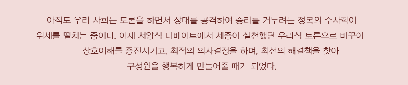 “경연을 한 다음 경연청에 나와서 종일토록 토론하게 하라”(세종실록 00/12/17). 세종은 절대군주의 위치에 있었음에도 토론의 생산성 을 간파하고 이를 실천하여 우리 역사에서 최고의 치적을 남긴 탁월한 리더이다. 아직도 우리 사회에서는 소통의 중요한 장르인 토론을 하 면서 상대를 공격하여 승리를 거두려는 정복의 수사학이 위세를 떨치고 있다. 이제 서양식 디베이트를 세종이 실천했던 우리식 토론으로 대체하여 을 해 성원간의 상 이해 진시키 최적의 의사결정을 하며 최선의 해결책을 찾아 성원을 더욱 행 하게만어 대체하여 토론을 통해 구성원간의 상호이해를증진시키고, 최적의 의사결정을 하며, 최선의 해결책을 찾아 구성원을 더욱 행복하게 만들어 주는 리더가 필요한 시점이다.