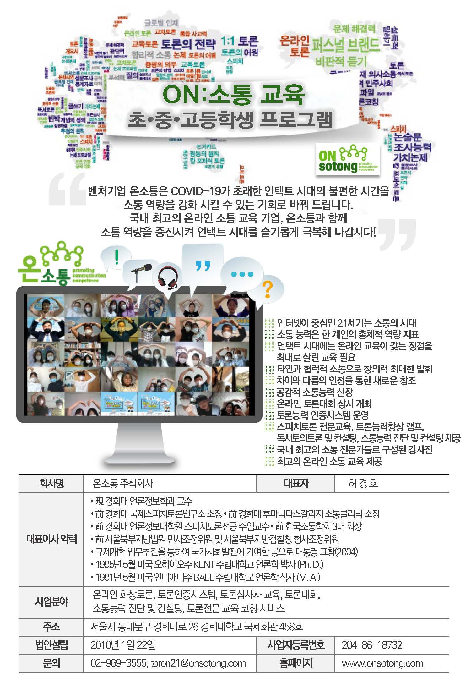 ▷ ON소통 교육 프로그램 [ON:소통교육안내] 온라인 프로그램 안내(공문포함) by onsotong 2020. 10. 6. [공문]안내_온라인소통교육프로그램_온소통2020.pdf 2.54MB 공유하기 게시글 관리 온소통 저작자표시 비영리 변경금지 (새창열림) '▷ ON소통 교육 프로그램' 카테고리의 다른 글 [프로그램안내] 온라인 ON:소통 교육(대회/인증제) 프로그램 안내(공문포함) (0) 2020.10.06 관련글 [프로그램안내] 온라인 ON:소통 교육(대회/인증제) 프로그램 안내(공문포함) 댓글