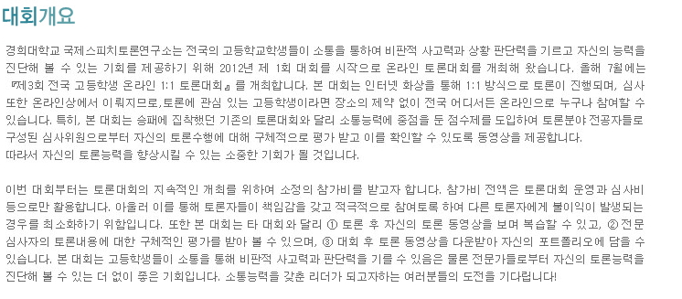| [2013년] 제2회 경희대 국제스피치토론연구소 주최 전국 고등학생 온라인1:1 토론대회 (0) | 2020.03.20 |