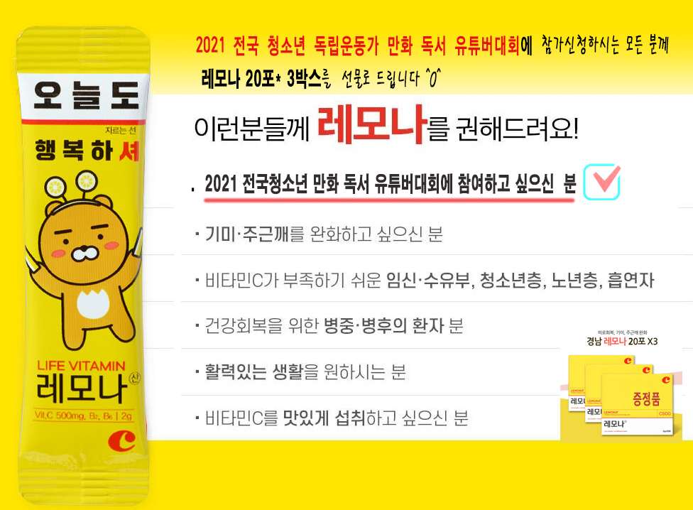 참가 신청자 모두에게 레모나 20포*3박스를 선물로 드립니다. (참가신청서 및 유튜버게시 영상주소 확인후 우편발송)