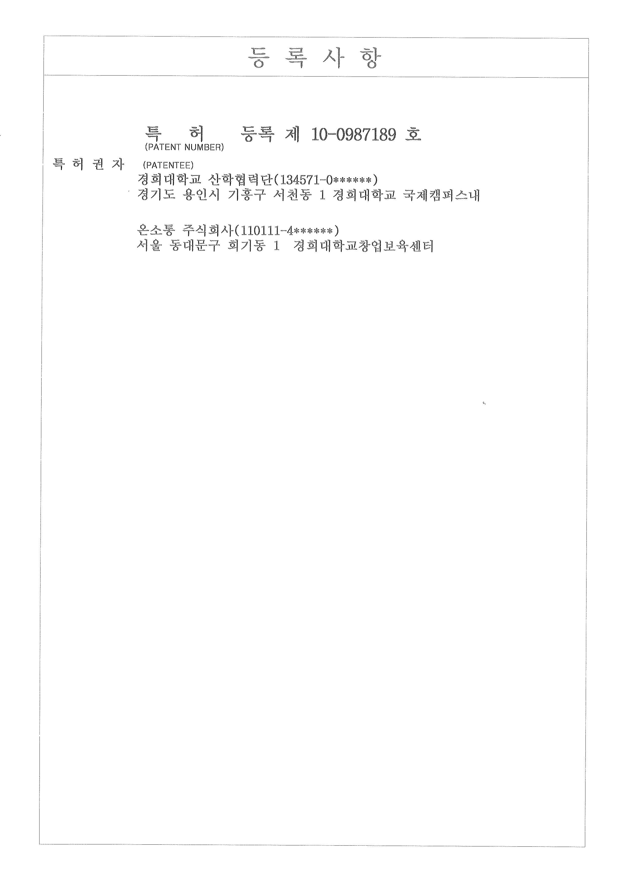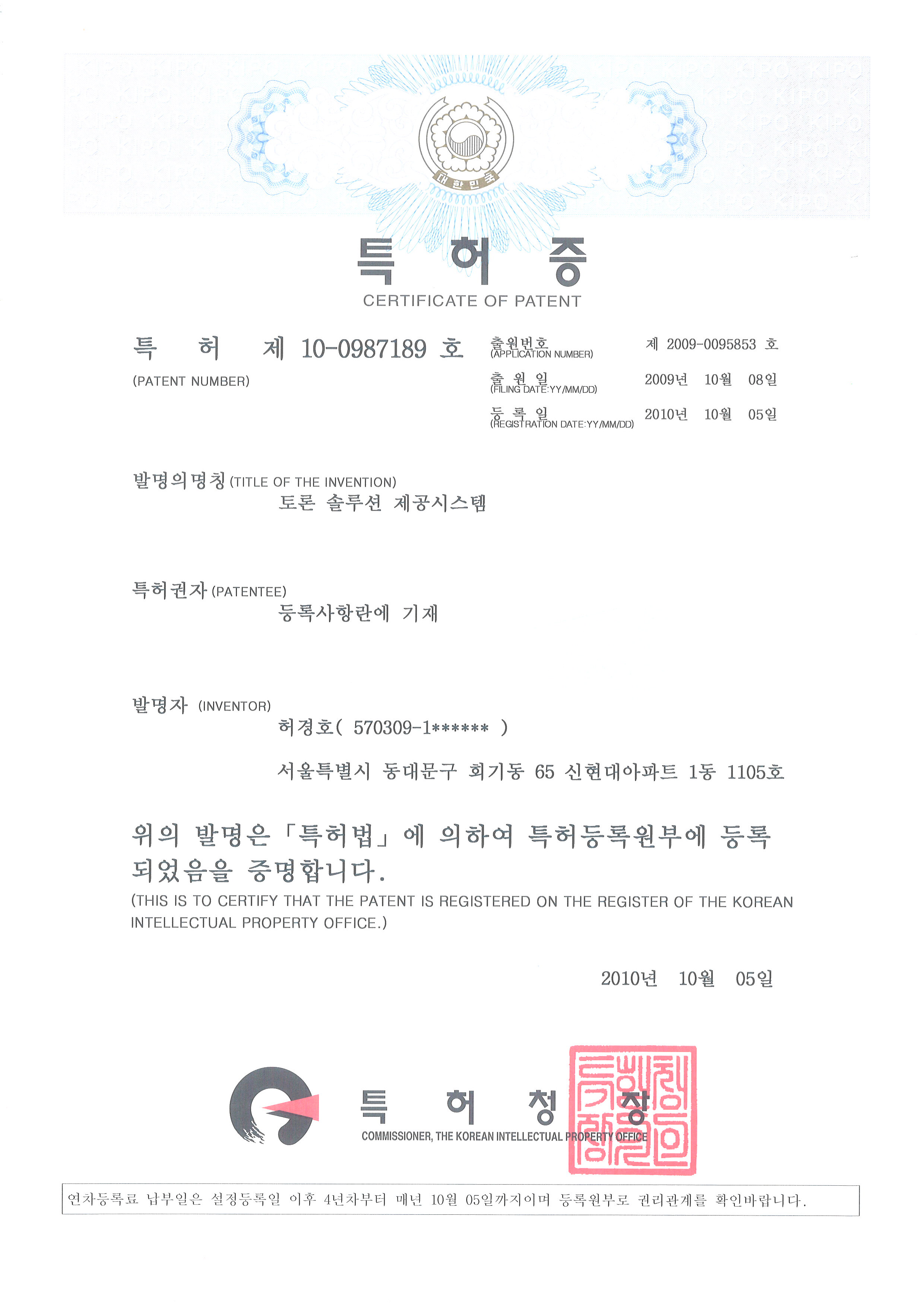 온소통 주식회사의 토론 솔루션 제공 시스템은 2010년 10월 5일 특허법에 의하여 특허등록원부에 특허 제10-0987189호로 등록되었습니다.