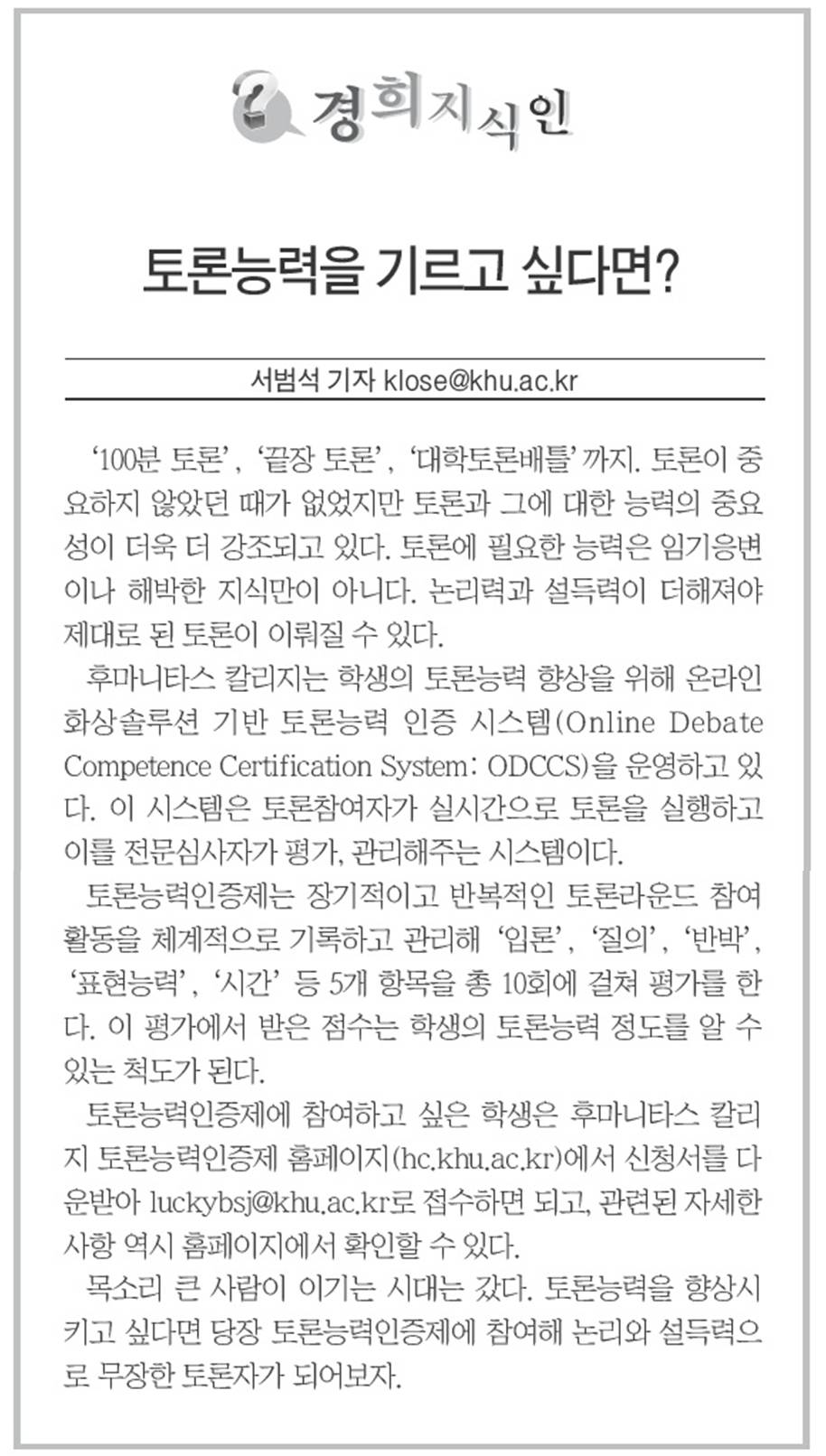 | [대학주보] 경희대 후마니타스칼리지_ 토론인증제_ 2011 동계방학 참가자 모집 (0) | 2020.03.20 |