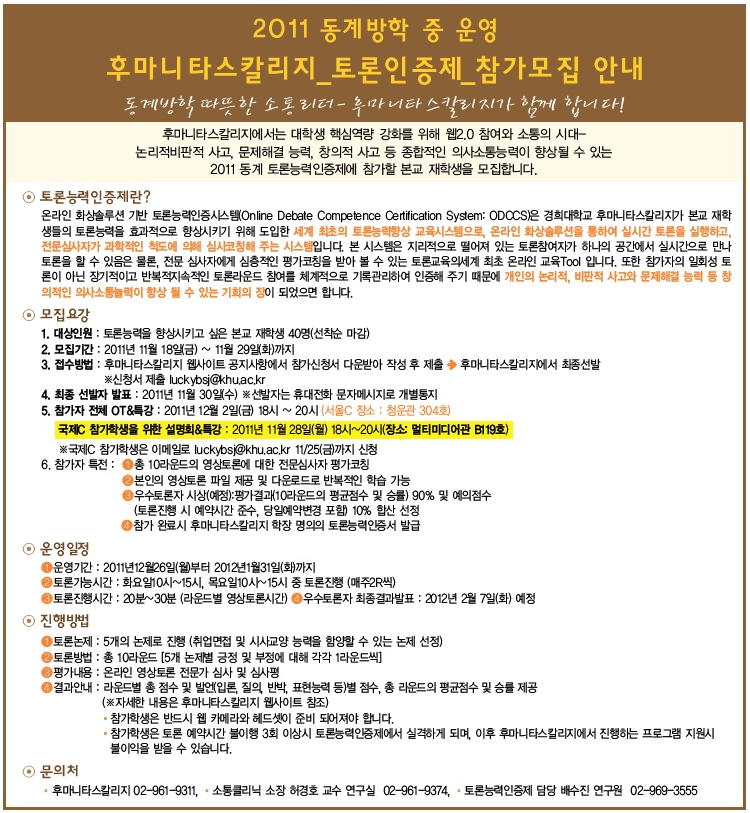 | [경향신문] 경희대 후마니타스 칼리지, 세계최초 온라인 화상 토론인증시스템도입 (0) | 2020.03.20 |