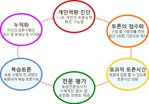 - 이 시스템은 토론참여자와 심사자가 오프라인에서 실시간으로 만나지 않고도 토론을 할 수 있음은 물론 자신이 행한 토론을 저장된 동영상 화면의 재생을 통해 전문 심사자의 심층적인 평가와 함께 복토(수행한 토론을 다시 봄)를 할 수 있어 토론 능력을 획기적으로 신장시킬 수 있는 교육도구이다.