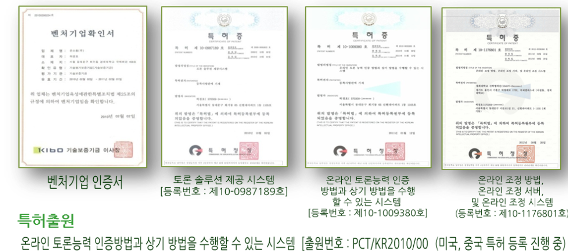 - 발명의 명칭: 온라인 토론능력 인증 방법과 상기 방법을 수행할 수 있는 시스템: 등록번호: 10-1009380(특허권자: 경희대학교 산학협력단, 온소통 주식회사)