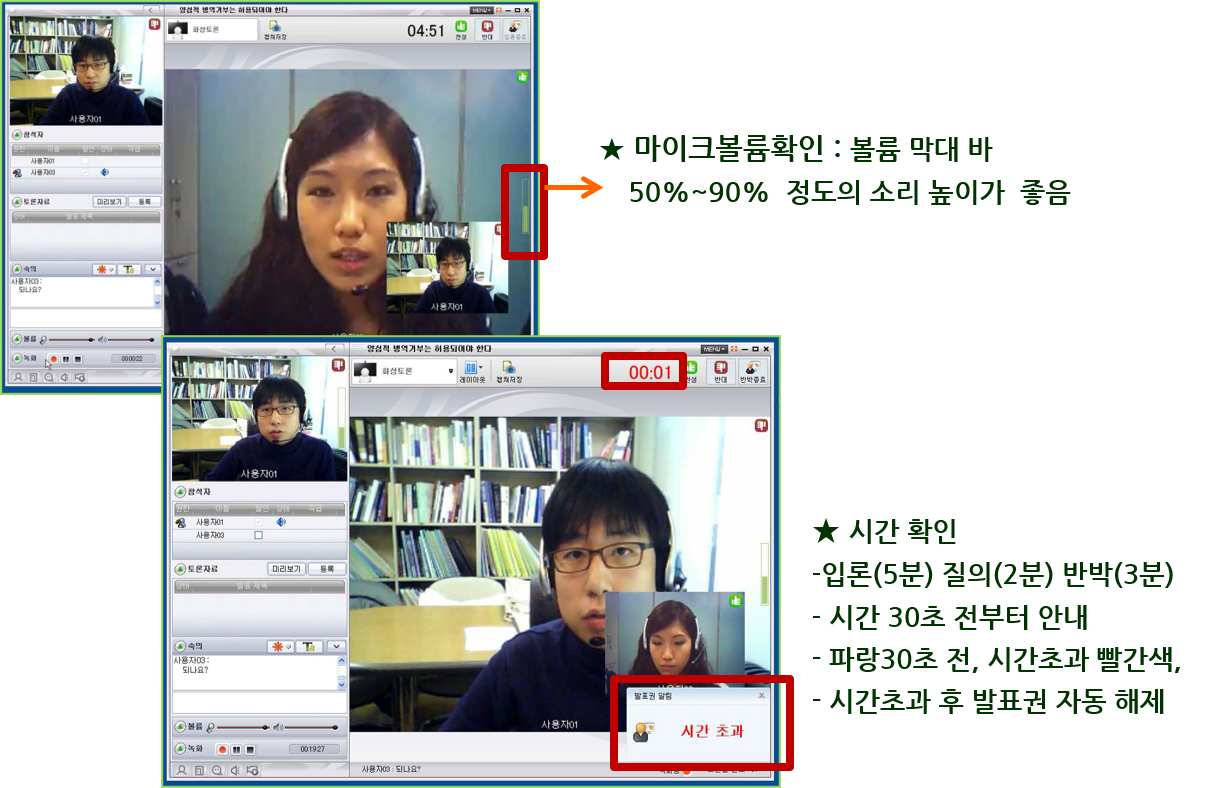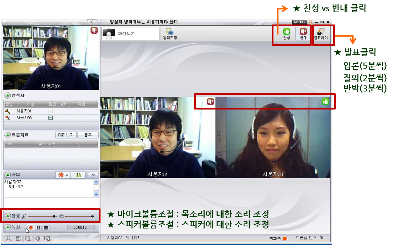 - 양방향 화상토론 솔루션을 기반으로 웹 카메라와 헤드셋을 활용하여 시ㆍ공간 제한을 벗어나 토론 참여자가 어느 곳에서든 실시간으로 토론을 수행